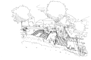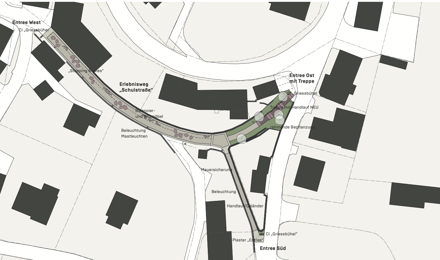 Der Verbindungsweg Grießbühel in Radenthein wird neu gestaltet und als attraktive Durchwegung aufgewertet. Ziel ist die Entwicklung eines lebendigen Straßenraums im Sinne einer Begegnungszone, die Bewegung, Aufenthalt und soziale Interaktion fördert. Die ‚Schulstrasse‘ wird mit Balancier- und Sitzmöbeln sowie spielerischen Elementen wie Trittsteinen ausgestattet. Platzartig gestaltete Ein- und Ausgänge schaffen einladende Aufenthaltsbereiche. Die bestehende Treppenanlage wird erneuert und hinsichtlich Sicherheit optimiert. Ergänzend sorgt ein durchdachtes Beleuchtungskonzept für Orientierung auf Aufenthaltsqualität.