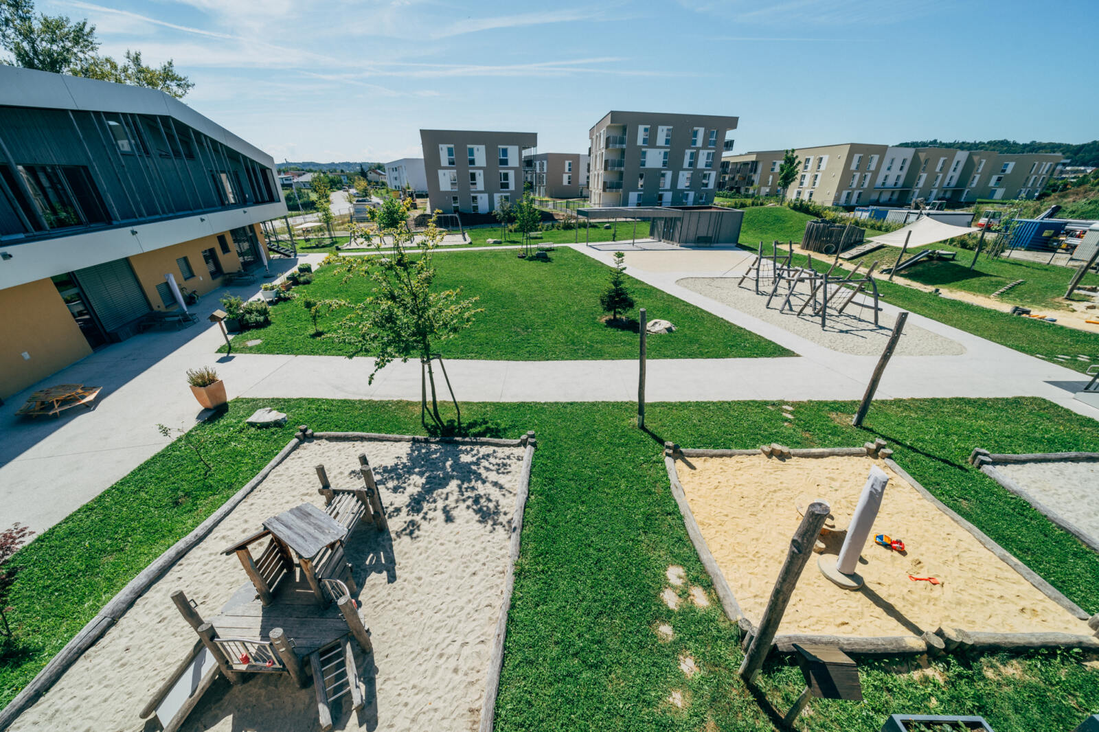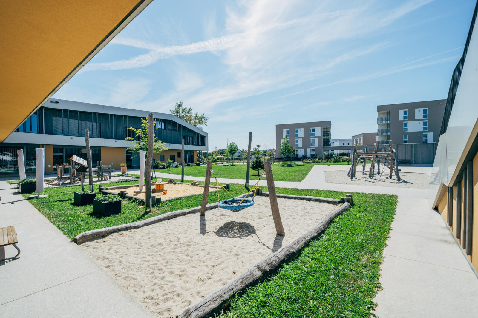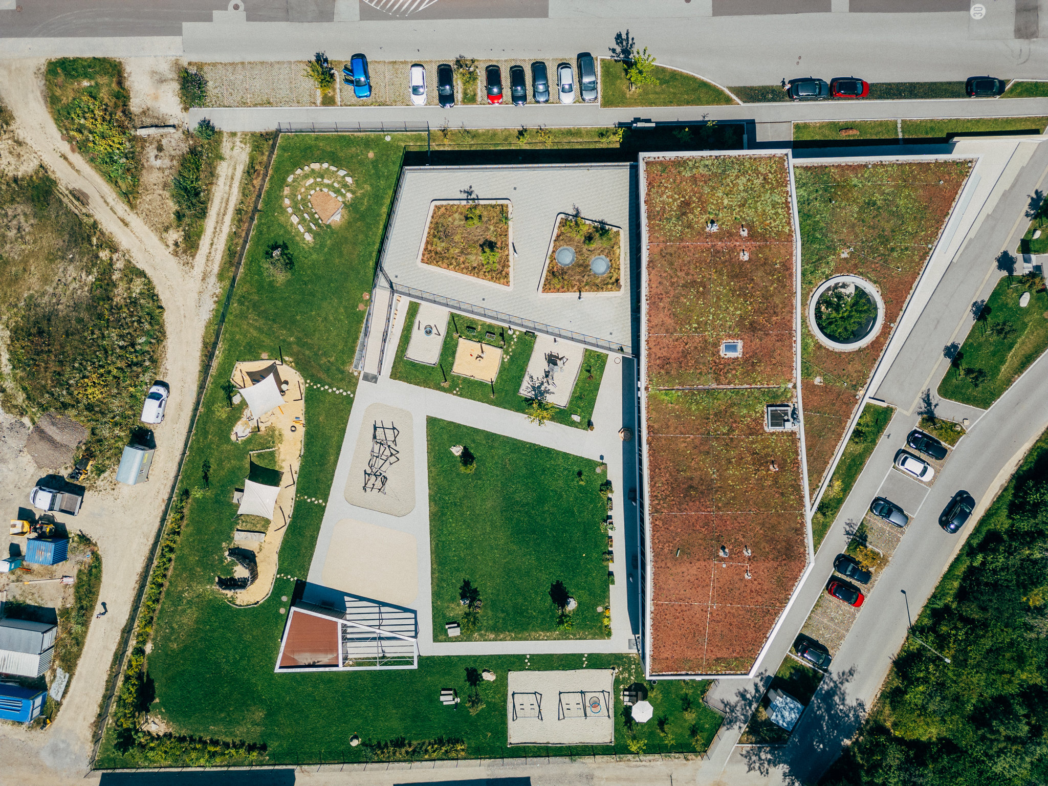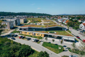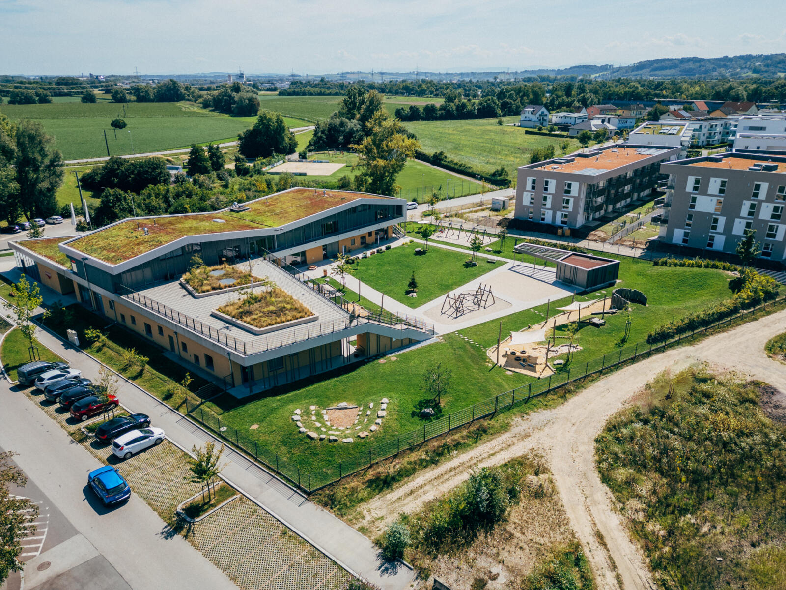 In Linz-Schwaigau entstand, neben einer Wohngebietserweiterung zur bereits bestehenden Siedlungsfläche, zentral eine neue Kindergarten Tagesstätte. Wesentliche Planungsinhalte waren die Neugestaltung des Vorplatzes sowie der zentrale Spielhof und der Dachgarten. Am Vorplatz der Kindergarten Tagesstätte öffnet sich das Entreè mit Baum, Sitzbank und klar strukturierter Drop-Off-Zone, die Aufenthaltsqualität bietet. Grüninseln mit Bäumen schaffen eine angenehme Atmosphäre und bilden zugleich einen harmonischen Puffer zum öffentlichen Raum. Im Inneren der Freianlage schließt der geschützte Bereich für die Kleinsten an, indem Sandspiel, Nestschaukel und ein Kinderspielturm erste Spielerfahrungen ermöglichen. Daran anschließend eröffnet sich der zentrale Spielhof für die älteren Kinder, der mit einer Ballspielwiese, Kletter- und Balanciermöglichkeiten sowie Sand- und Matschbereichen vielfältige Bewegungs- und Entfaltungsmöglichkeiten bietet. Differenziert gestaltete Flächen schaffen Struktur und der naturnahe Spielbereich mit Lesebereich ergänzen das Angebot. Auf der Dachterrasse verbinden Sitzstufen, Schattenbäume, und offene Bewegungsräume Erholung mit Aktivitäten.