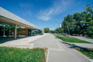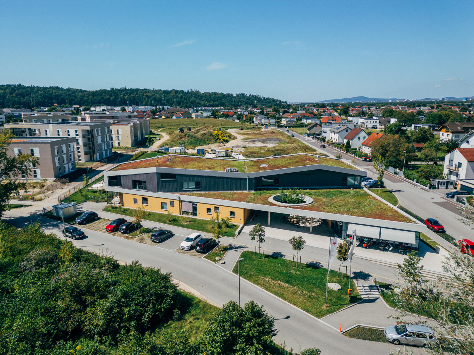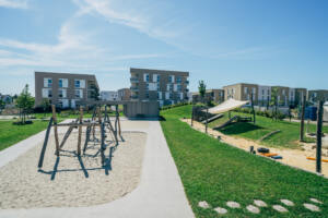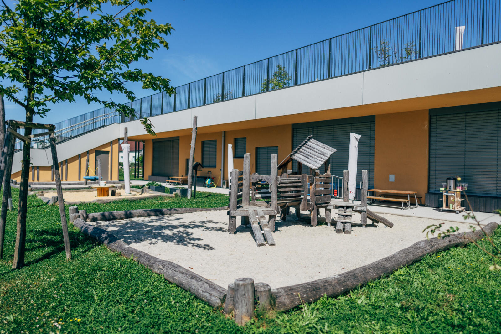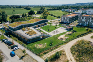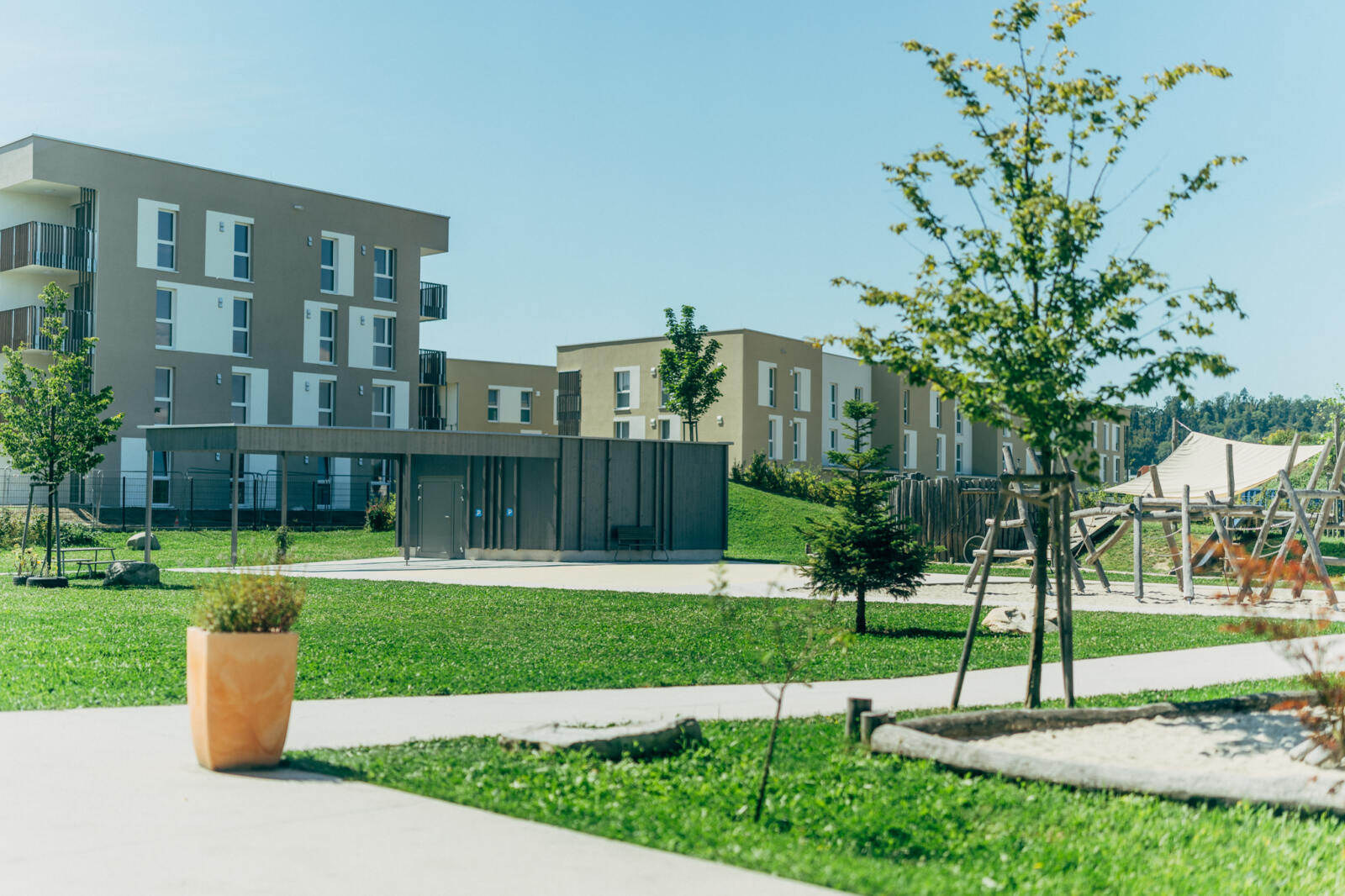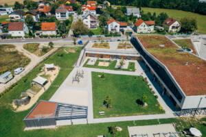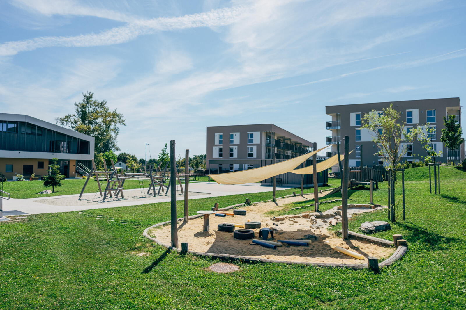 In Linz-Schwaigau entstand, neben einer Wohngebietserweiterung zur bereits bestehenden Siedlungsfläche, zentral eine neue Kindergarten Tagesstätte. Wesentliche Planungsinhalte waren die Neugestaltung des Vorplatzes sowie der zentrale Spielhof und der Dachgarten. Am Vorplatz der Kindergarten Tagesstätte öffnet sich das Entreè mit Baum, Sitzbank und klar strukturierter Drop-Off-Zone, die Aufenthaltsqualität bietet. Grüninseln mit Bäumen schaffen eine angenehme Atmosphäre und bilden zugleich einen harmonischen Puffer zum öffentlichen Raum. Im Inneren der Freianlage schließt der geschützte Bereich für die Kleinsten an, indem Sandspiel, Nestschaukel und ein Kinderspielturm erste Spielerfahrungen ermöglichen. Daran anschließend eröffnet sich der zentrale Spielhof für die älteren Kinder, der mit einer Ballspielwiese, Kletter- und Balanciermöglichkeiten sowie Sand- und Matschbereichen vielfältige Bewegungs- und Entfaltungsmöglichkeiten bietet. Differenziert gestaltete Flächen schaffen Struktur und der naturnahe Spielbereich mit Lesebereich ergänzen das Angebot. Auf der Dachterrasse verbinden Sitzstufen, Schattenbäume, und offene Bewegungsräume Erholung mit Aktivitäten.