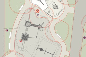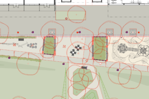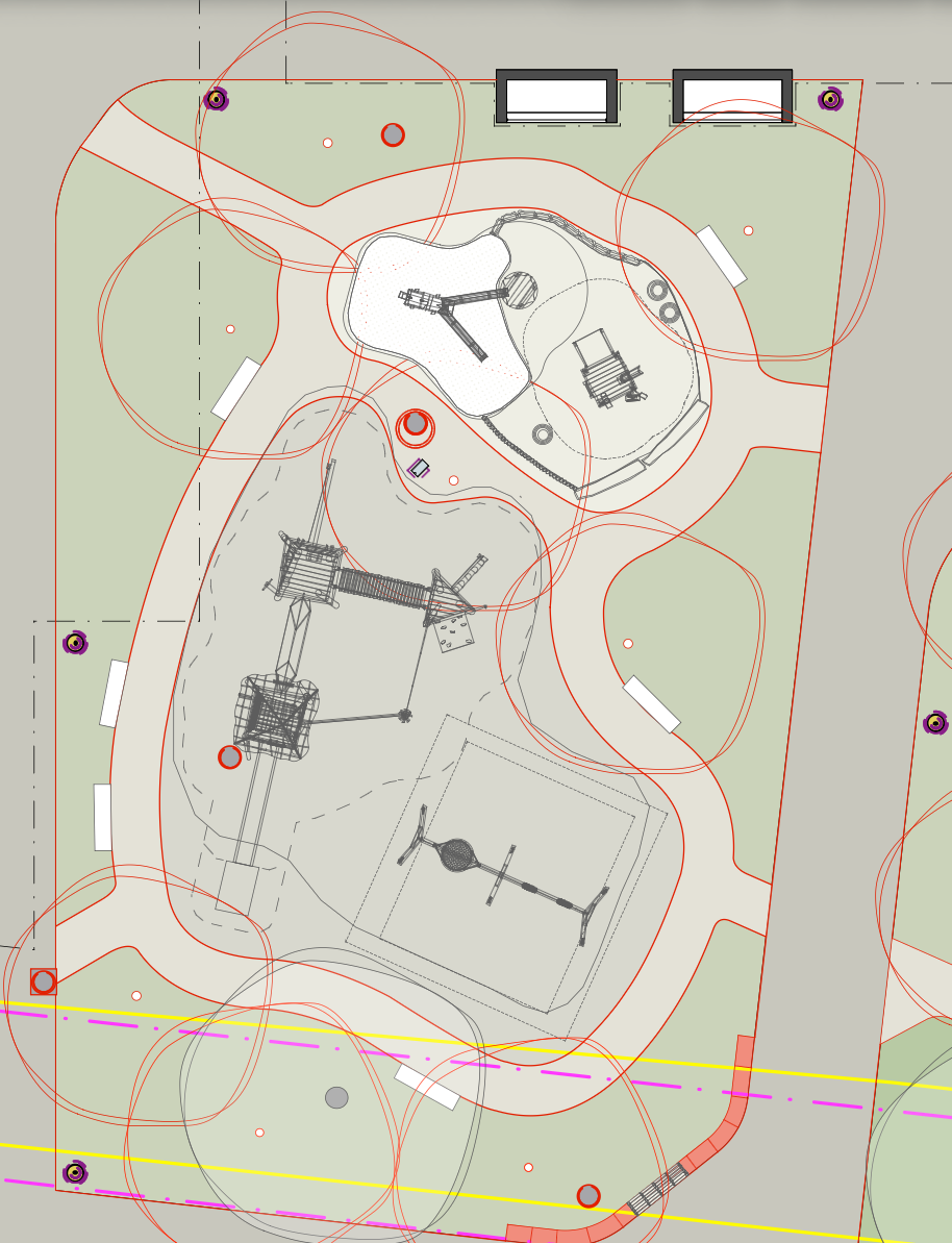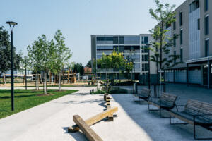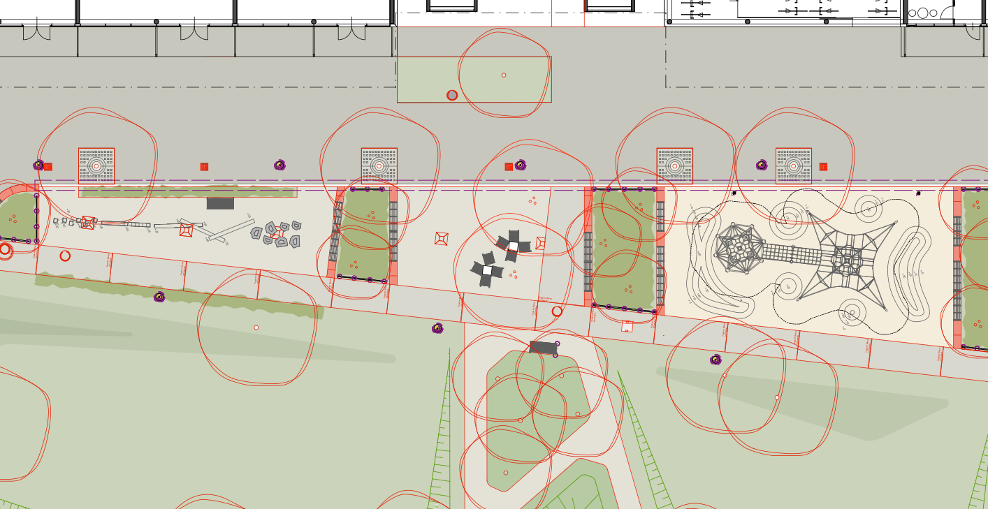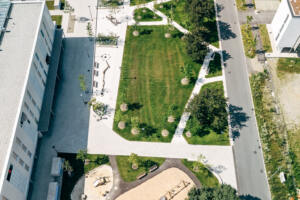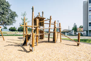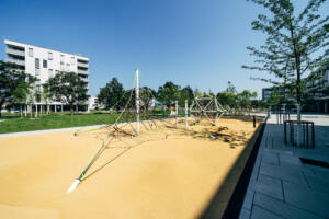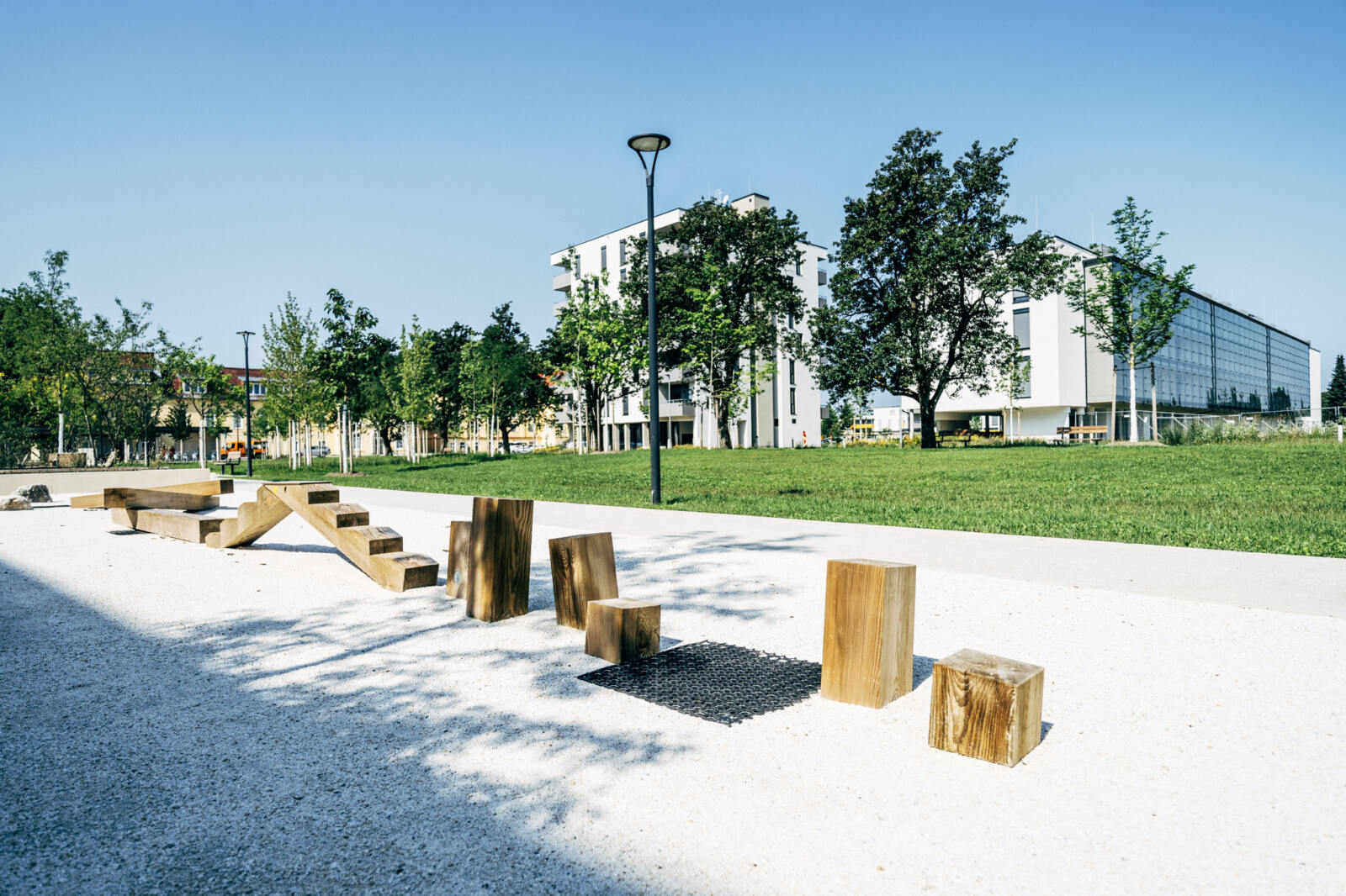 Der urbane Spielbereich bietet Kletternetze und eine Balancierstrecke, die Bewegung, Geschicklichkeit und Koordination fördern. Schachtische ergänzen das Angebot und schaffen einen Treffpunkt für alle Generationen.