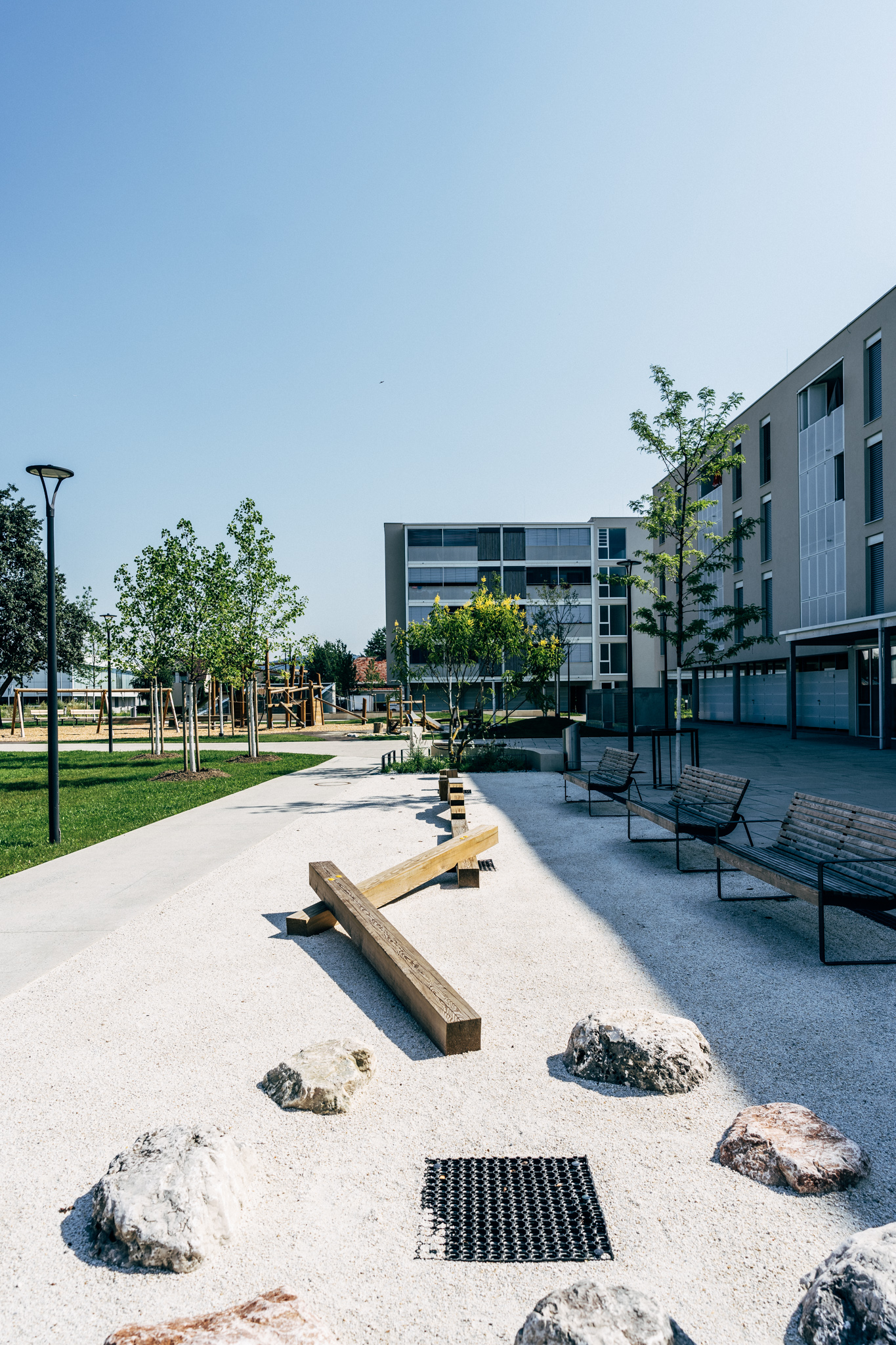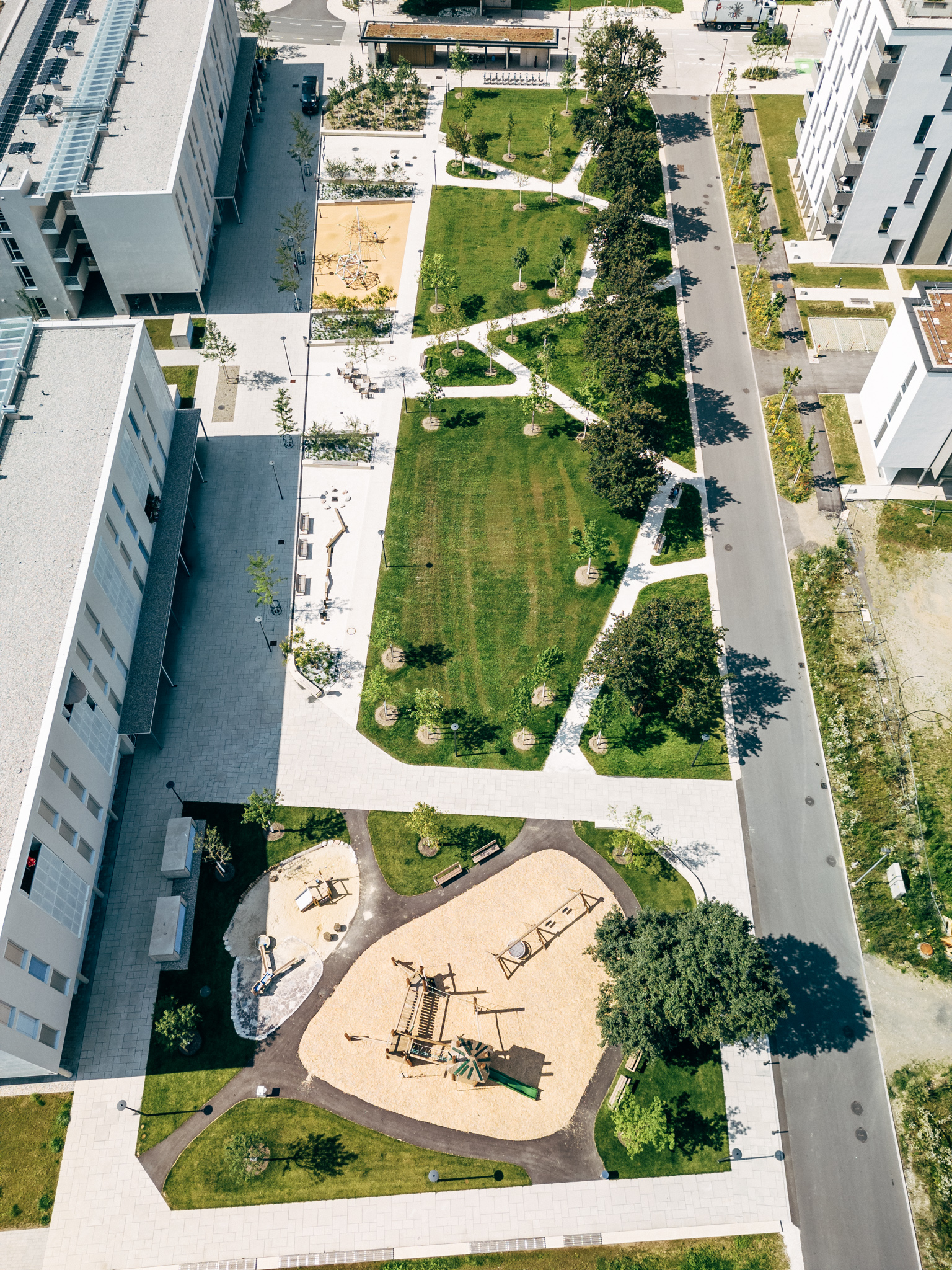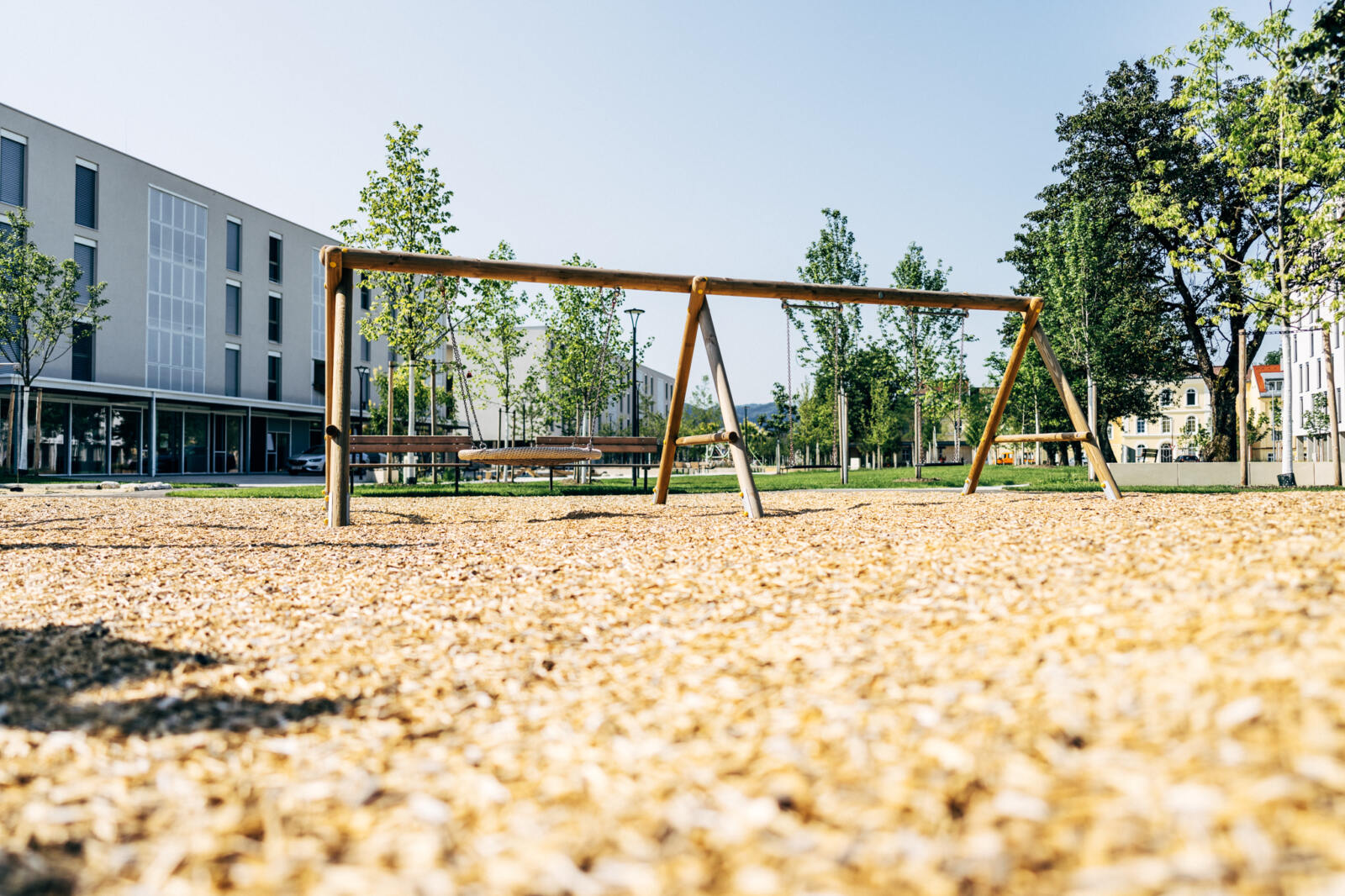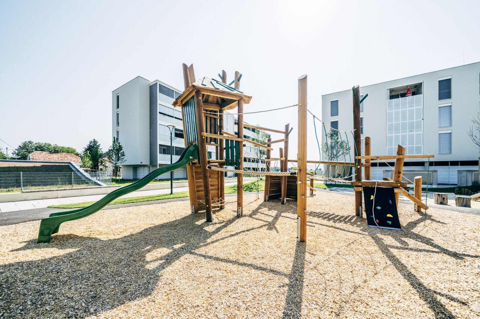 Der naturnahe Kinderspielplatz lädt mit einem Baumhaus inklusive Seiledschungel und Rutsche zum abwechslungsreichen Spielen ein. Ein Wasser- und Sandspielbereich ermöglicht kreatives Entdecken und Erleben. Klassische Schaukeln sowie eine Netzschaukel runden das Angebot ab. Begrünte Spielwiesen schaffen zusätzliche Aufenthaltsqualität.